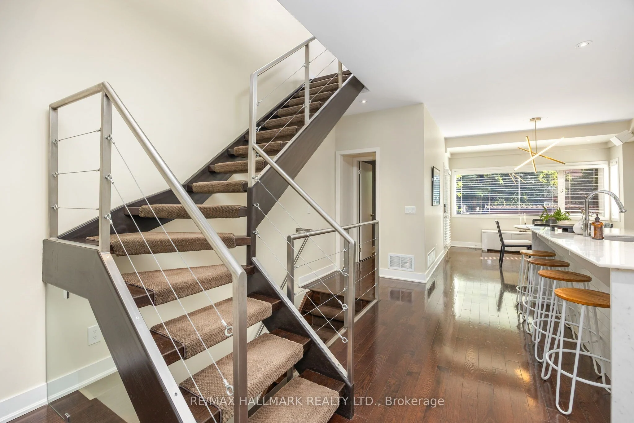 Enjoy rare ravine-side living in this stylish detached home backing onto the Don Valley. The bright, open-concept main floor features large front windows with serene views of nearby trails, creating a strong indoor-outdoor connection. Upstairs, two generous bedrooms open onto a private rooftop terrace – perfect for entertaining or relaxing under the stars. The finished basement includes a versatile third bedroom or office with direct access to the laneway and covered carport. This hidden gem offers peaceful urban living with direct access to nature, transit, and parks just steps away.